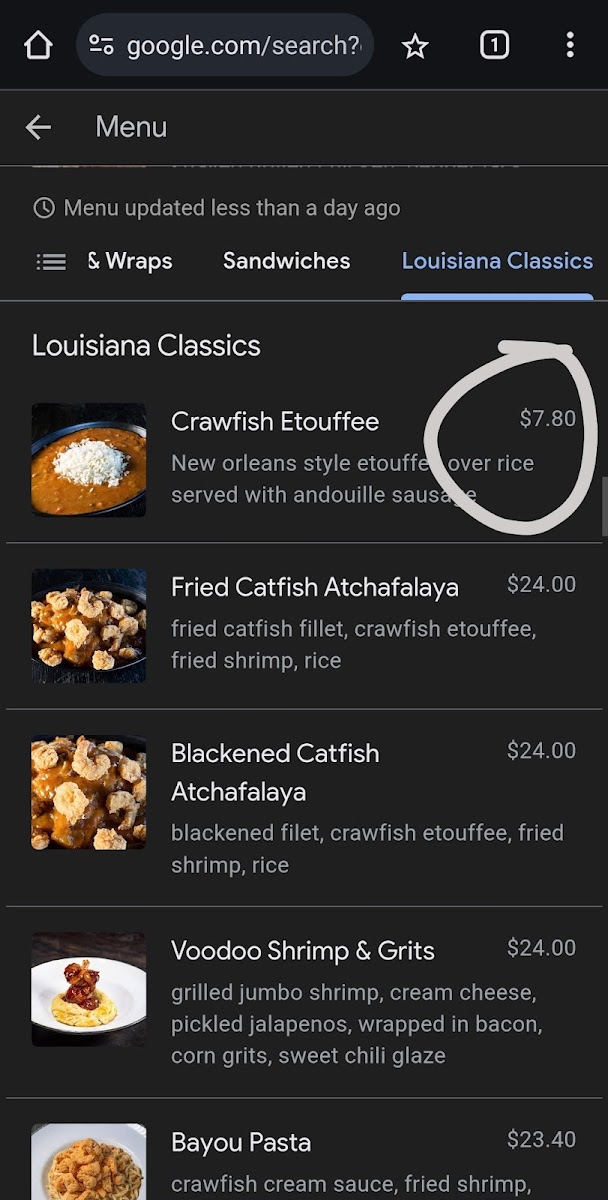 blackened or fried catfish fillets over rice, topped with crawfish étouffée and hand-battered shrimp